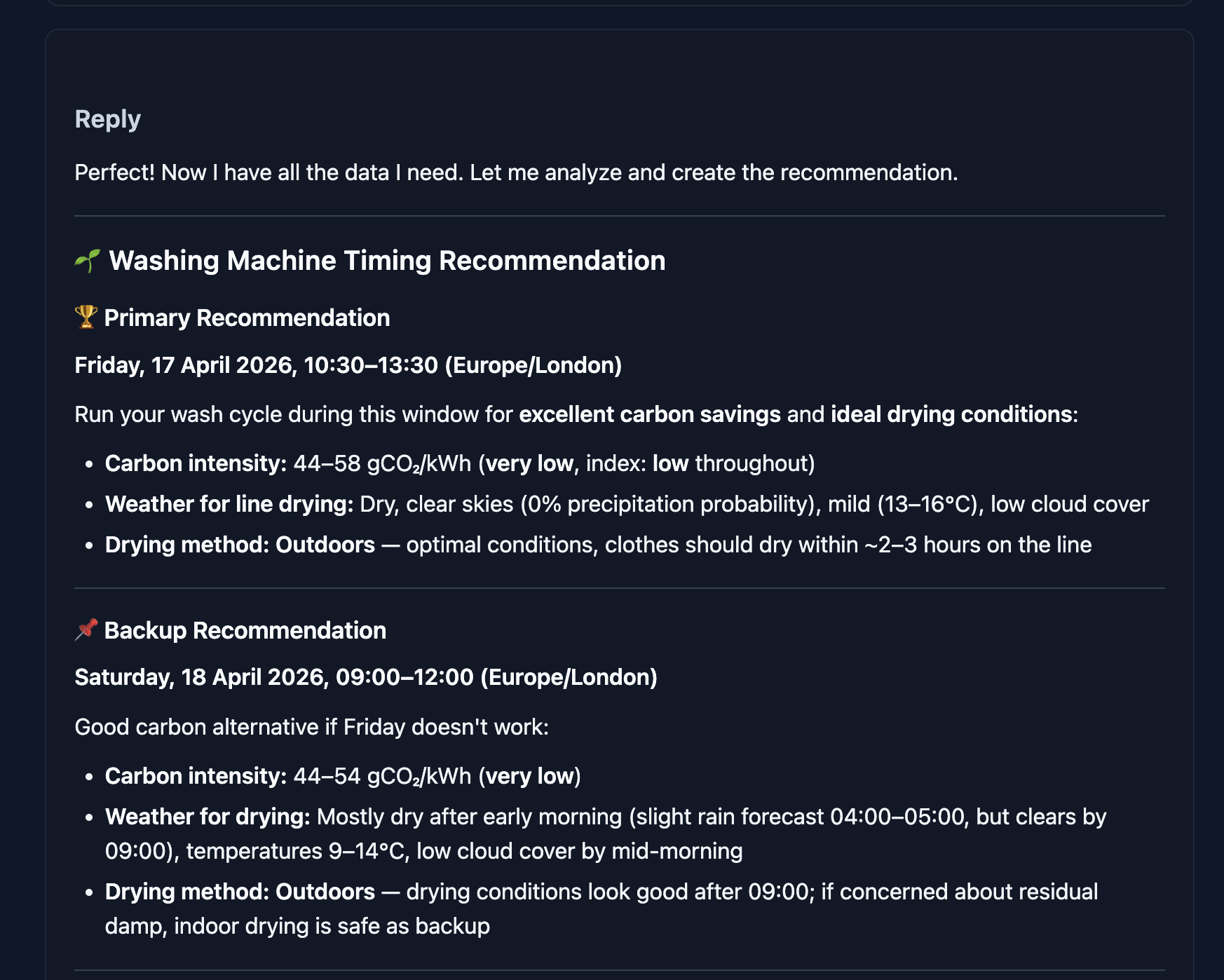 Another area is evaluations - I’d like to do mocked tool response testing where I see how the LLM responds if rain is predicted every day, and at every interval the grid has loads of carbon. I’d like to verify this using behavioural testing, with another LLM as a judge.