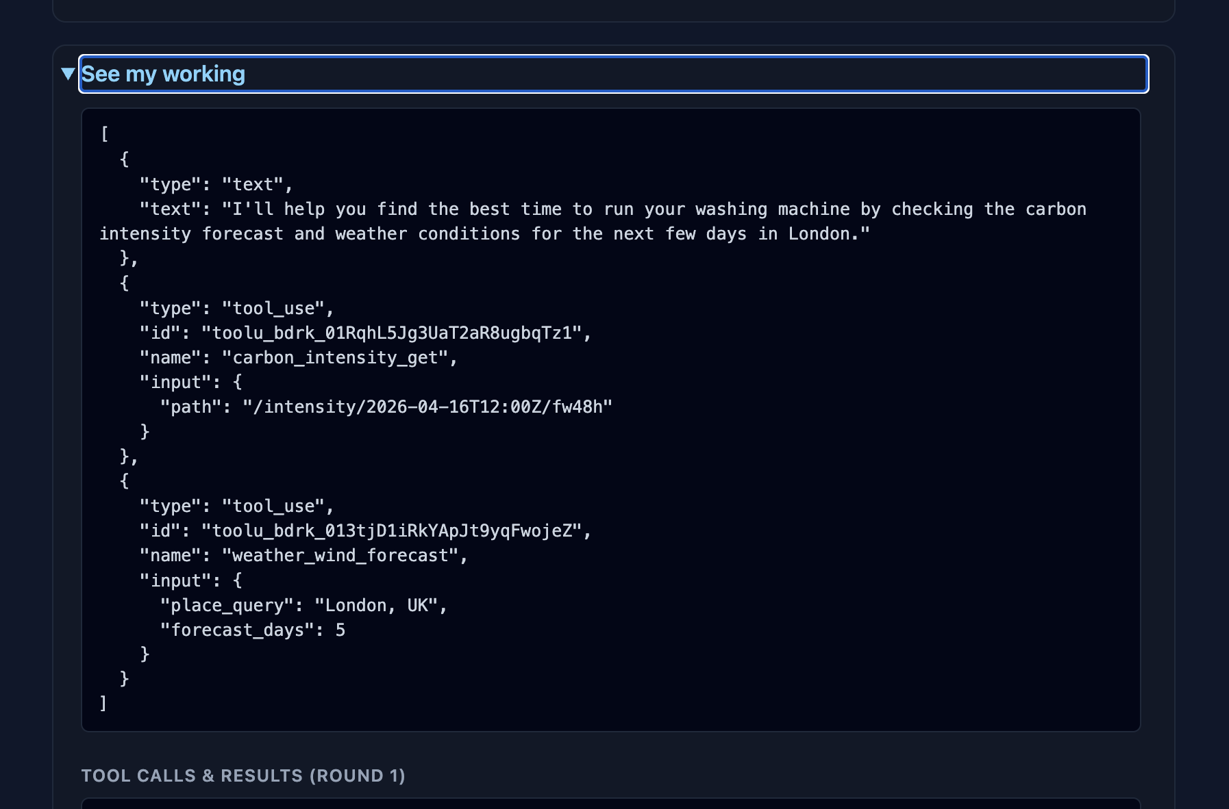 I was also interested in letting the model decide which tools to call. Right now it mostly defaults to the grid forecast, but exposing the agent calls in the UI makes that behaviour visible, which is useful.